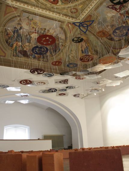 The theme of Art Descending upon the Earth especially emphasises the artist's work in the field of integral ecology. He has been developing different approaches to cooperate with the Earth's consciousness and nature's manifold worlds, whether in the form of Earth acupuncture (lithopuncture) or of geomantic interpretations of individual places and landscapes. Another exhibition theme opens the question of how can art contribute to the transformation of the human civilisation on Earth, which is becoming increasingly destructive. The exhibition unfolds different possibilities of using artistic language in the communication with nature's consciousness and the rise of human self-perception − both in relation to the multi-dimensionality of life and space. Together with his wife Marika, he builds installations made of natural materials, which offer an immediate experience of invisible dimensions of space to visitors. In the Knights' Hall of Maribor Art Gallery, they set up the installation Art Descending upon the Earth which creates a relation to the 19-century ceiling frescos presenting famous battles of the Holly Roman Empire of the German Nation.