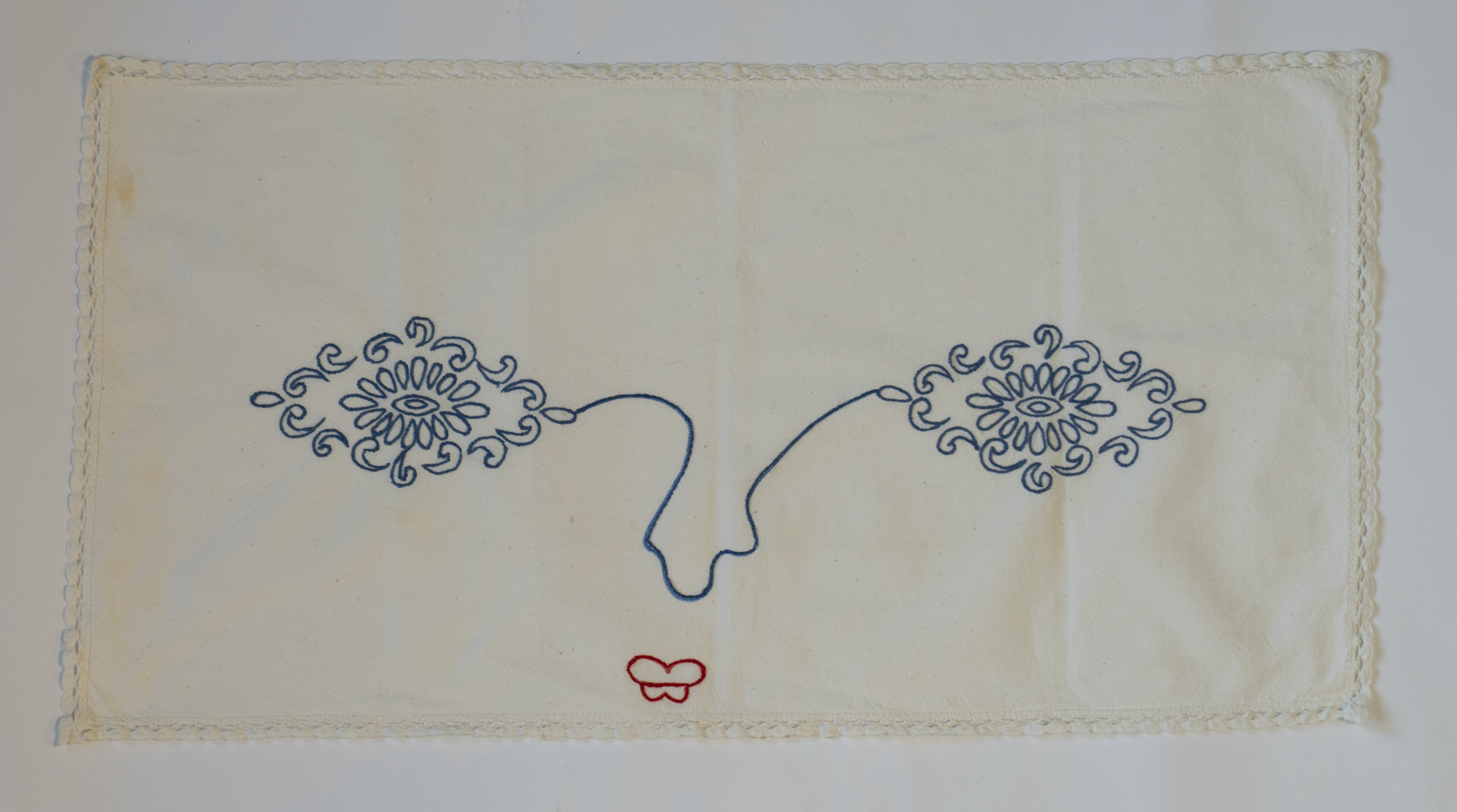The exhibited works connect several series, mostly created as a result of cooperation between the artist and her mother. First a drawing is made on the fabric, then it is embroidered. Together, they test the color of the thread, the density and tempo of the embroidered stroke, the effects of various drawing bases and the materiality of the recycling of historical napkins. Motively, these napkins are close to large format embroidery. The ribbons with embroidered refrains are a bit different: “I'm a punk, rocker and hardcore at heart. It’s music that’s been driving me for 35 years. On vacation, I played music and transcribed song titles. In 2016, we also started an embroidery project with a friend, and these ribbons are the work of her hands. "