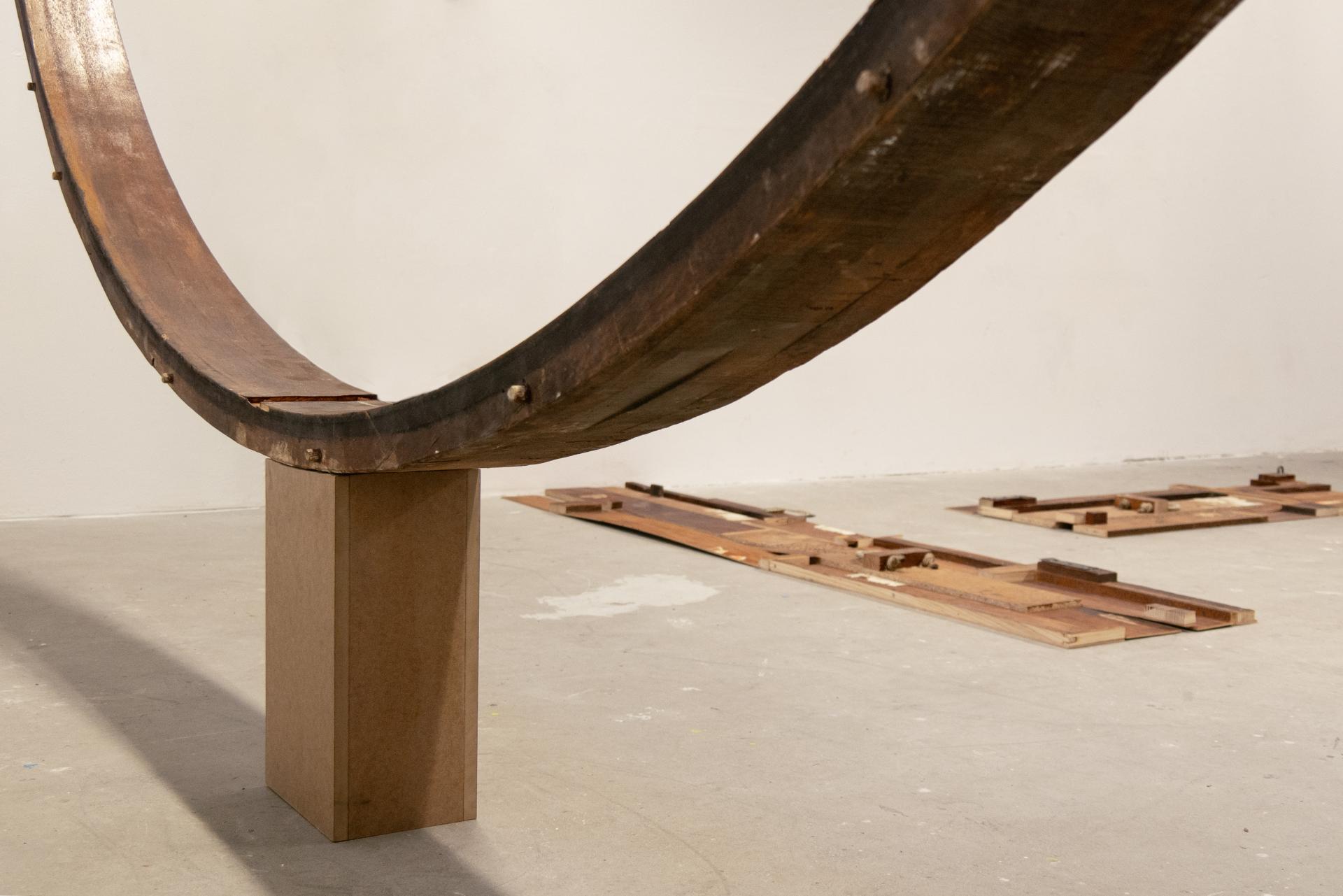 The Cabinet is inhabited by four objects – more precisely, a set of anti-objects – each of which, in its own way, “undermines” specific architectural elements of the exhibition space: the passage, the vault, the floor, and the walls. These anti-objects do not function as autonomous sculptures, but as situations that both reveal and destabilise spatial conventions. In this sense, their approach may be compared to Sartre’s notion of the “anti-novel” – works that assume the form of the novel only to dismantle and question it from within.