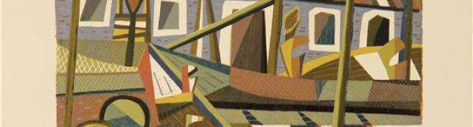 Hailing from Trieste, Lojze Spacal (1907−2000) was a pivotal figure of the 20th century art scene, creating at the intersection of two worlds. In his extensive body of work, he established himself in Slovenia, Italy, and beyond as a subtle poet of Karst. After World War II, he played an important role of introducing Slovenian artist to current modernist trends. Following his period of intimist painting, after the war he became increasingly focused on printmaking. In the early 1950s, the artist's attention was drawn to motifs related to the littoral world. The different objects (boat, nets, house, fence, barrel, lamp) in the colour woodblock print Boats and Nets are counterposed in a way that colour and texture fill every inch of the image. The dynamic square design and the subdivision into smaller planes are reminiscent of French cubism. The print reveals the fundamental construction elements of Spacal's images: verticals, horizontals, simple line patterns, inclusion of basic shapes, such as the circle, the square, and the triangle. Over the next two decades, he radically refined these elements and started to approach them as signs. By adopting flatness, straightforwardness, and simple motifs, Spacal went beyond the established Slovenian academic frameworks and introduced the idea of artistic freedom.