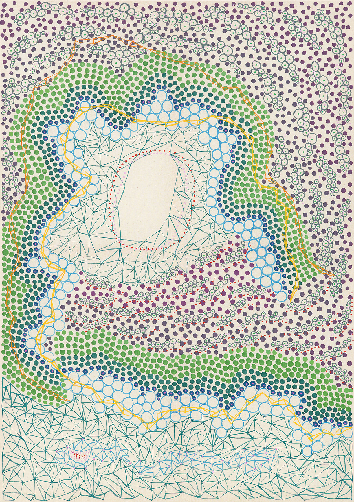 Simona Šuc writes in her sketchbook, for example: "To outline a perfect circle, means to seek perfection, to resort to illusion." This sentence portrays the movement and awareness of the painter's hand, as well as the awareness that in creation only a convergence towards perfection exists. The awareness that the circle created by her hands is not perfect does not deter her from the chosen form; it is sufficient for her to reach this realisation. In fact, the circle is perfect in its imperfection. It is perfect for its own purpose. It represents the basic component of her painterly visions, enabling her to create countless versions and variations, countless mental landscapes, countless colour perspectives of the immense range of colours, as the title of her current exhibition suggests.