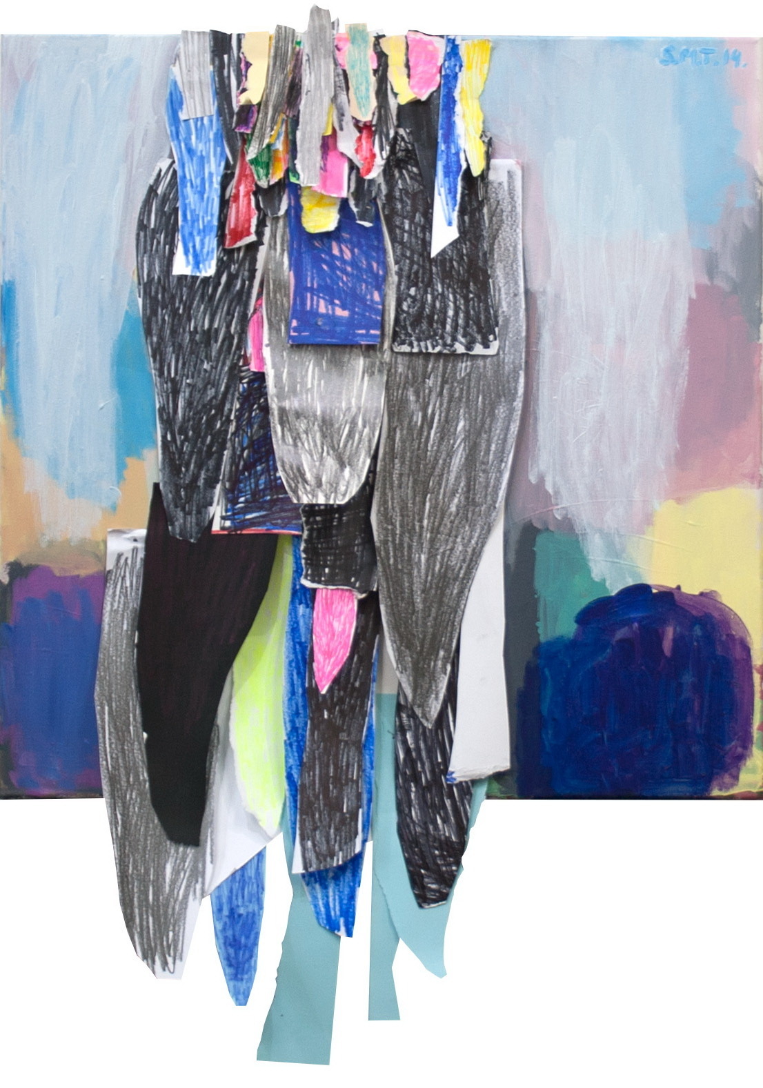 In her work, Sladjana Matić Trstenjak draws from landscape motifs and natural phenomena, which she gradually abstracts and creates colourful compositions in soft forms. The painting surface consists of several layers of coloured surfaces that overlap each other in seemingly rapidly painted layers. In the collage technique, the artist adds scaly structures that flow like a waterfall over the top edge and fall over the bottom edge of the painting in the middle of the painting surface. Shades of pink, sky-blue and light yellow colour are further accentuated through the contrast to the rough criss-cross surfaces painted in black. Using a variety of techniques, materials, shapes and colours, a playful effect is achieved, which at times feels as if the picture is sticking its tongue out at us.