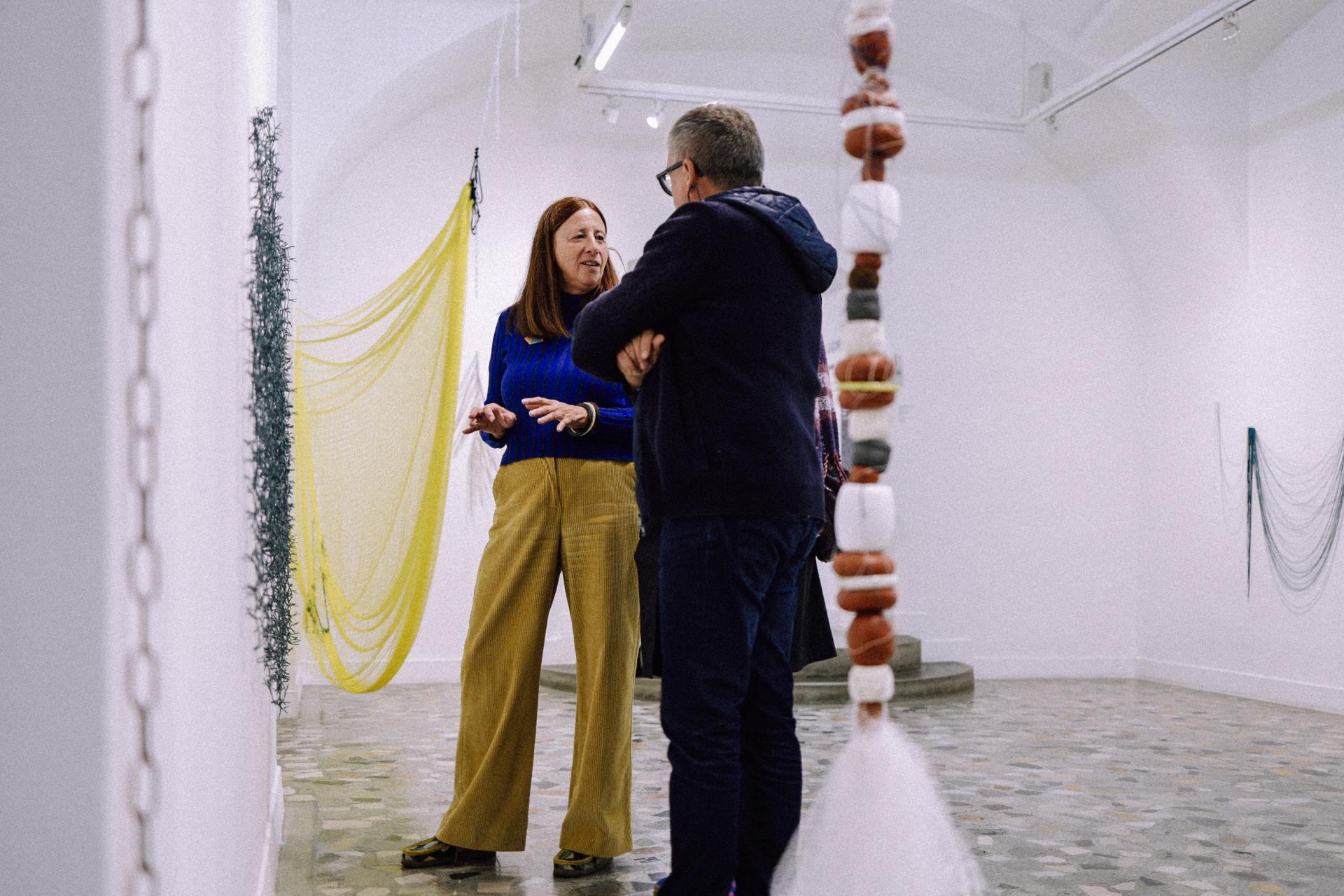 Pomemben element so tokrat tudi pletilke, ki jih umetnica že dlje časa zbira v centrih ponovne uporabe. Nekoč je veliko pletla zase, danes pa pletilke postajajo barvit gradnik njenih skulptur (Ribja kost in Krivolov).